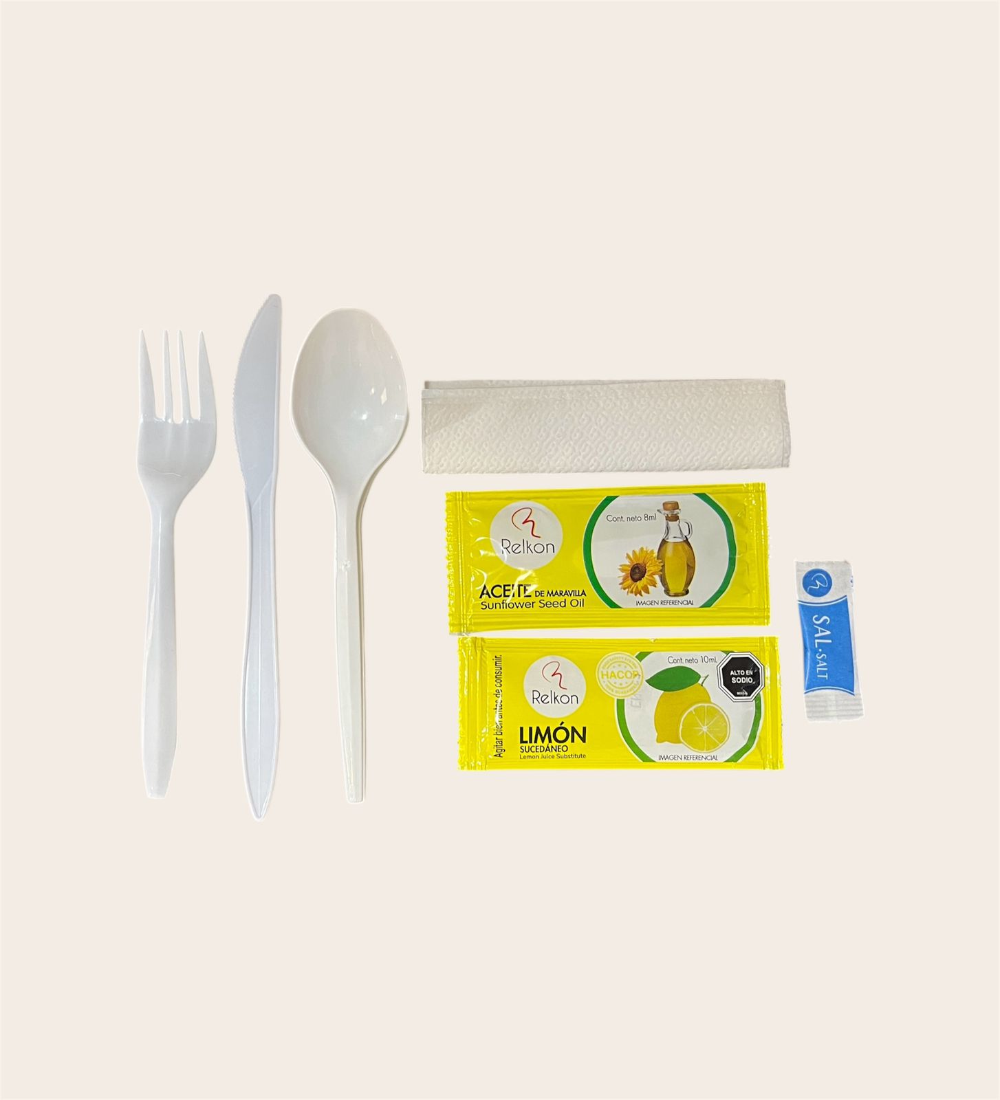 El PACK CUBIERTOS N°7 es clave para la excelencia en el delivery. La integración de cubiertos y aliños (aceite, limón y sal) en un solo kit es un valor agregado que eleva la calidad del servicio de Comida para Llevar. Su embalaje de 400 unidades asegura una logística mayorista ágil, higiénica y altamente rentable para el canal profesional.